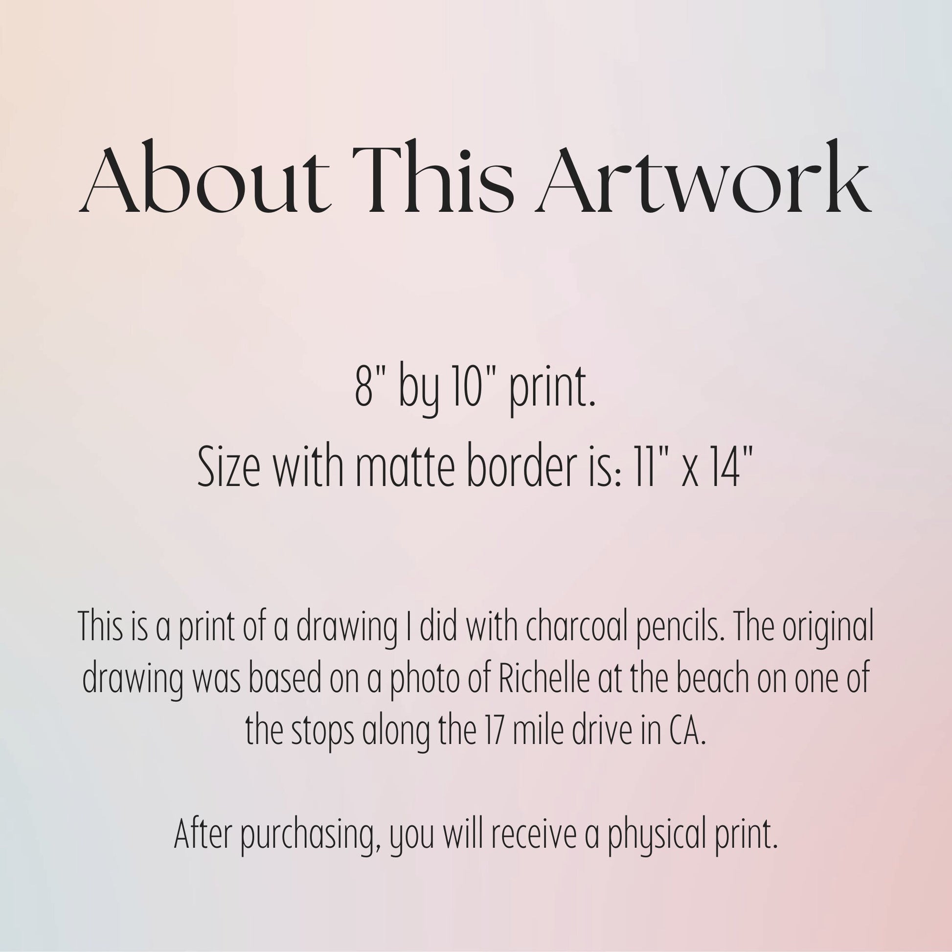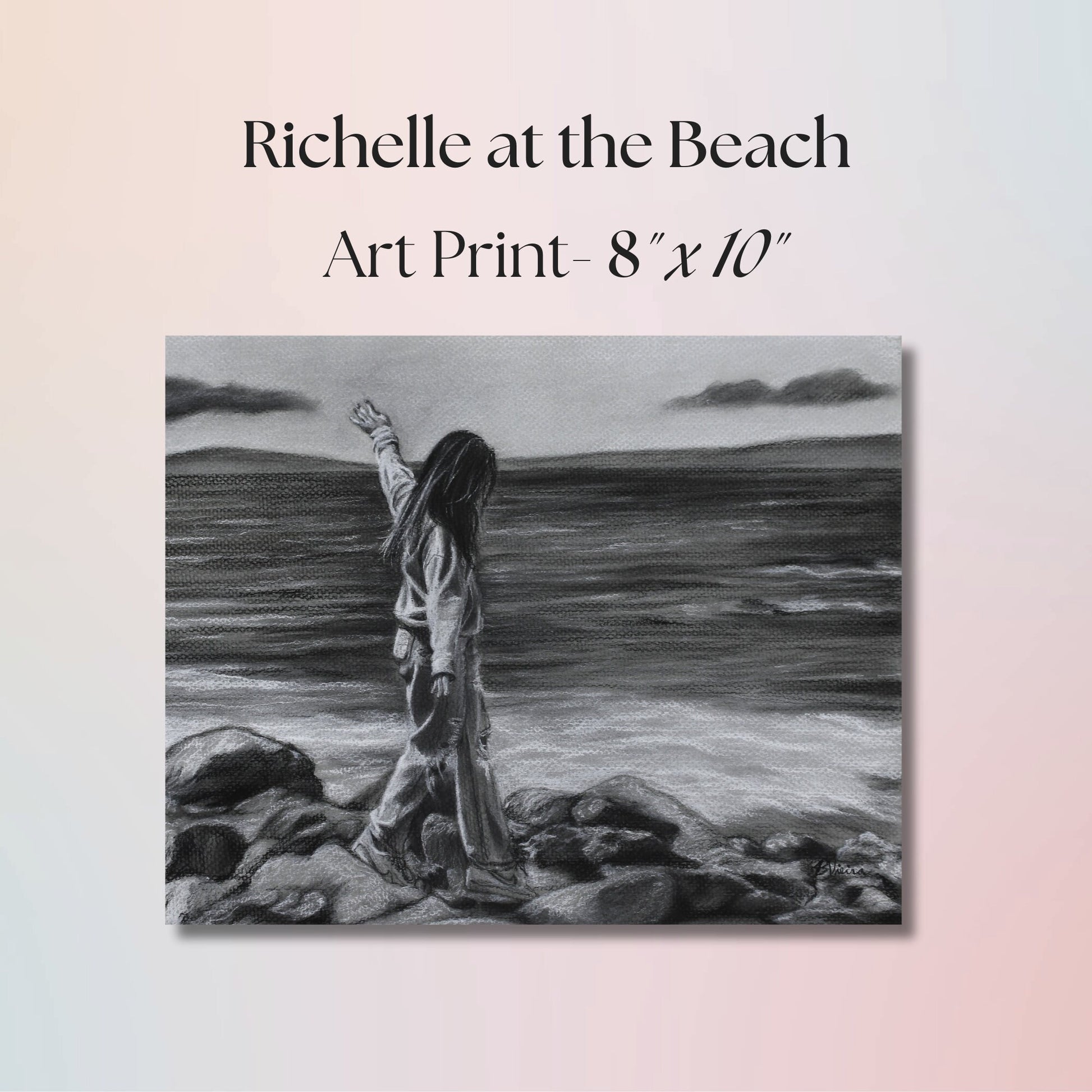 The original drawing was based on a photo that I took of my cousin while we were visiting Monterey, CA. This piece is entitled: "Richelle at the Beach"